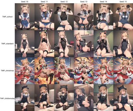 这是一个包含角色 TMP(少女前线)四种不同皮肤的 LoRA 模型。您可以使用提示词 TMP_standard、TMP_school、TMP_childrensday、TMP_christmas 来生成不同的图片。LoRA 权重 0.8 可能比较合适。示例图片使用模型 AbyssOrangeMix2_sfw.safetensors 生成。