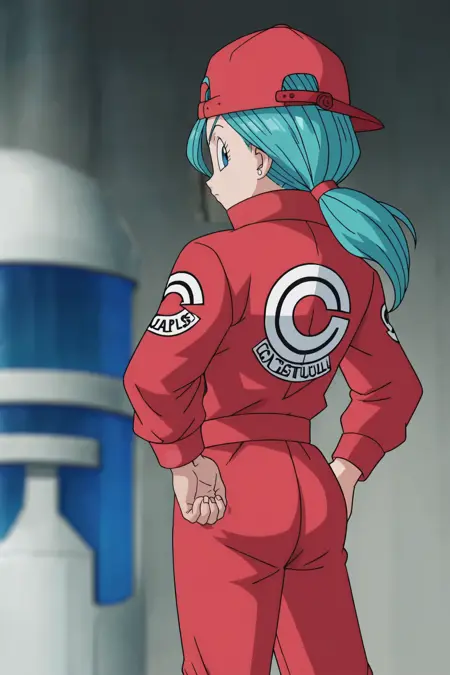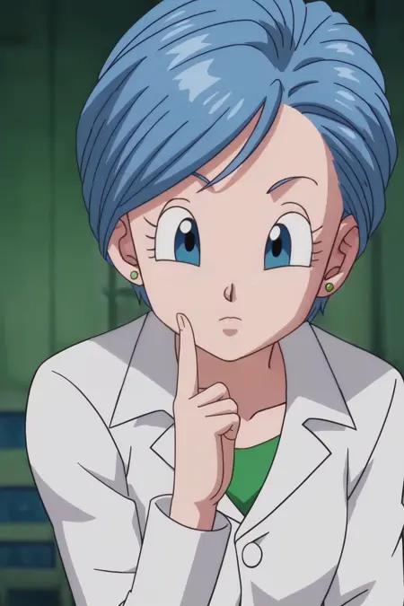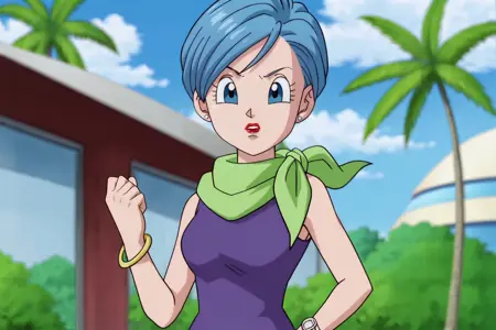 ブルマ、未来、アクア色の髪、ポニーテール、低めのポニーテール、青い目、口のマーク