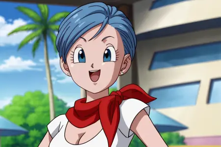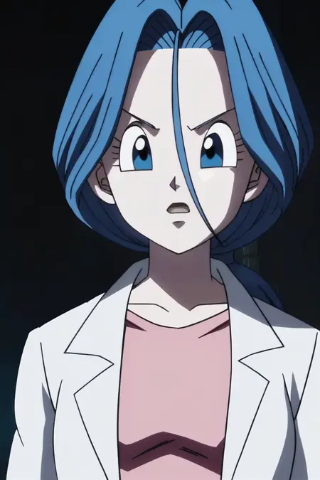 ブルマ、未来、青い髪、ポニーテール、低めのポニーテール、青い目、口のマーク