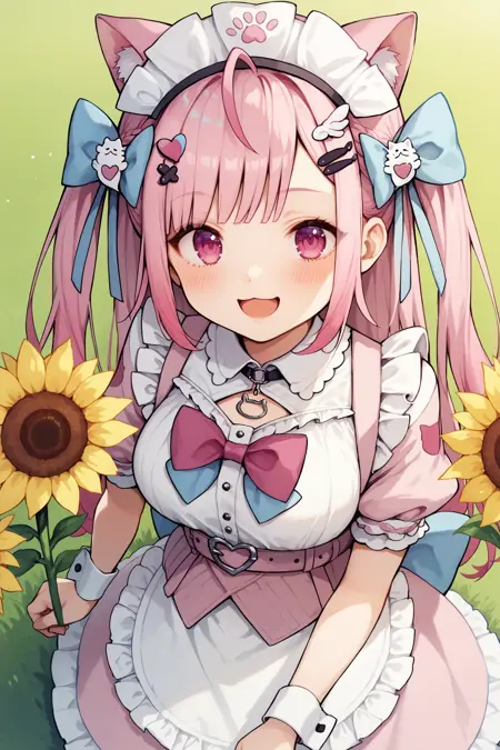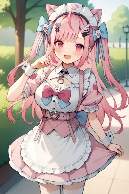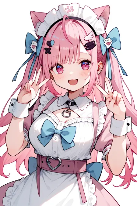 yuuki sakuna, long hair, hair ornament, bow, animal ears, pink hair, blush, cat ears, maid headdress, hair bow, frills, hairclip, pink eyes, pink bow, blue bow, maid, puffy sleeves, two side up, cat hair ornament, ahoge, heart hair ornament, puffy short sleeves, clothing cutout, pink dress, blue bow, colored inner hair, two-tone hair, cleavage, breasts