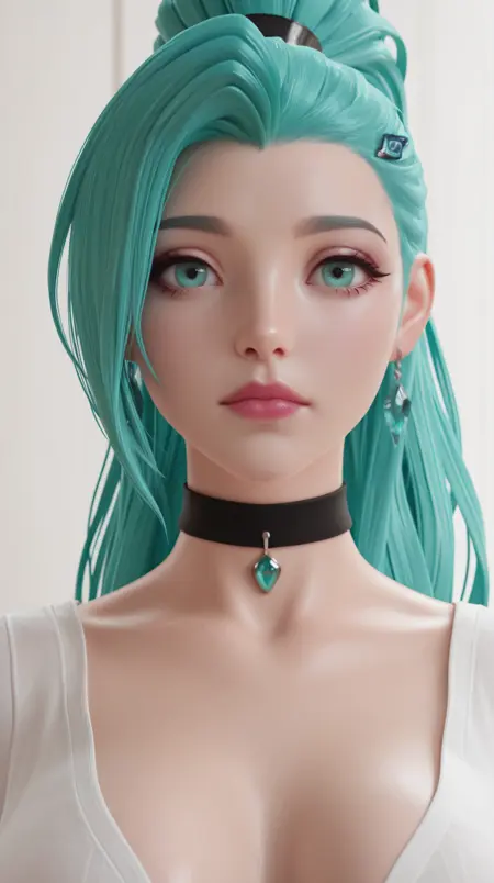 얼굴 태그: 긴 머리, 메이크업, 청록색 머리, 립스틱, 긴 머리, 높은 포니테일, 청록색 눈