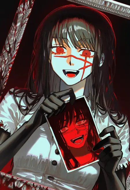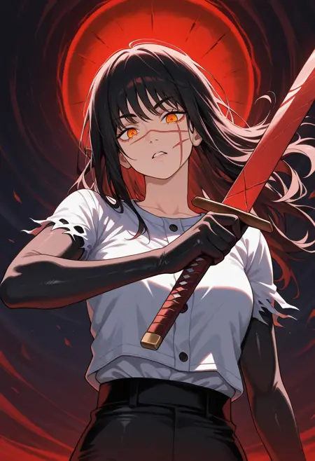 요루 \(체인사이만\), 고리 모양의 눈, 붉은 눈, 얼굴에 흉터, 검은 머리, 긴 머리, 검은 리본, 검은 치마정장,