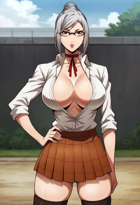 m3iko sh1rak1, grey hair, hair bun, glasses, brown eyes