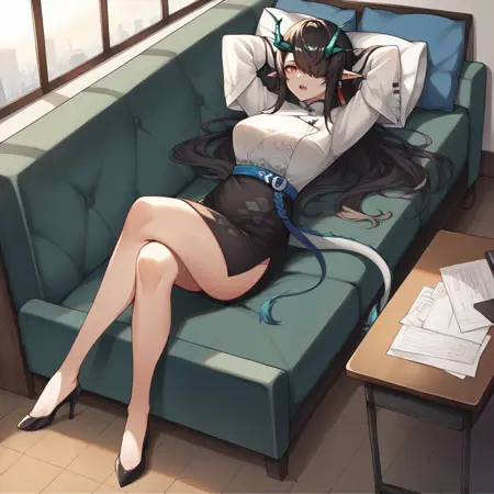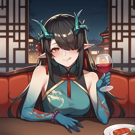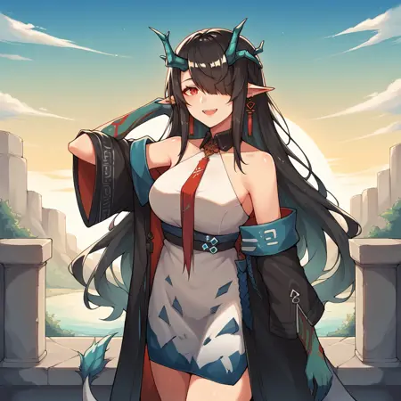 DuskArk, 황혼 (arknights), 붉은 눈, 용 꼬리, 뿔, 색상이 있는 피부, 검은 머리, 긴 머리, 녹색 피부, 뾰족한 귀, 한쪽 눈 위의 머리카락
