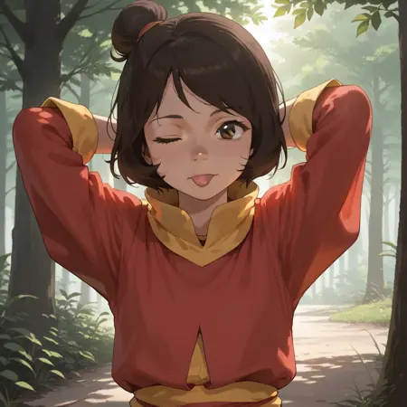 jinora_k, 1girl, short hair, brown hair, single hair bun, brown eyes, monk clothes
