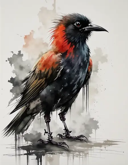 以下动态提示有助于增加变化:{1-3$$bold {paint|ink} drips cascading down|dripping ink|dynamic {red and black|black|black and blue} {splashes|splatters} in the background|strong shadows and {highlights|contrast|atmospheric depth}|high detail with flowing brushstrokes}