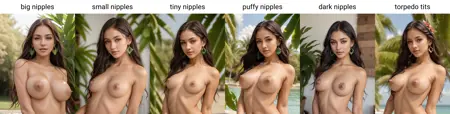 善用权重。有时你几乎得到了想要的效果,只需要微调一下。别害怕使用低权重的触发词,例如 (saggy breasts:0.2)。