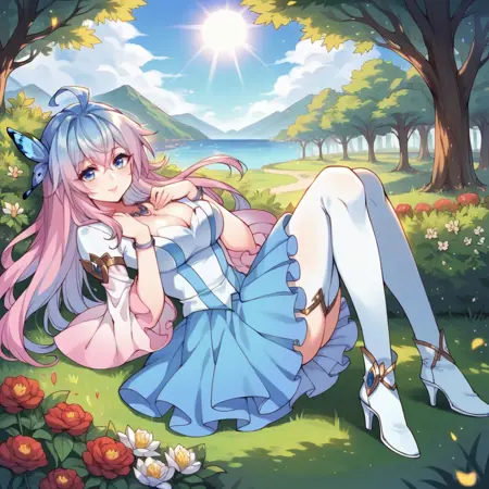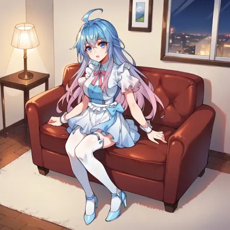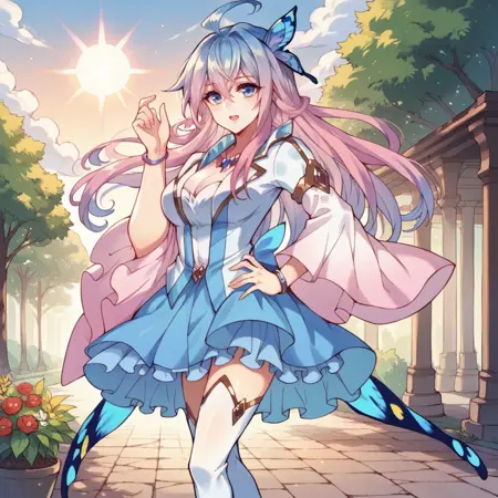 WangQiu, Wnq_1st, 渐变发色, 蓝发, 粉发, 长发, 蓝眼, 天线发, 双色上衣, 浅蓝上衣, 白色上衣, 有领上衣, 高腰裙, 粉色蝴蝶结, 粉色丝带, 蓝色蝴蝶结, 长丝带, 胸部丝带, 胸部饰物, 蓝宝石, 荷叶边袖子, 短袖, 渐变袖子, 蝴蝶发饰, 百褶裙, 白色裙子, 白色腕饰, 白色过膝袜, 过膝袜,
