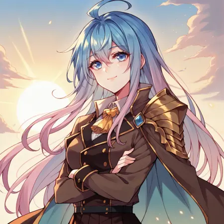 WangQiu, Wnq_7th, 渐变发色, 蓝发, 粉发, 长发, 蓝眼, 天线发, 黄色领结, 双排扣, 翅膀发饰, 单翼, 单肩甲, 肩部护甲, 金色盔甲, 军装, 替代白色上衣, 衬衫, 制服, 棕色夹克, 荷叶边领结, 胸部束缚带, 低胸, 肩部斗篷, 白色斗篷, 腕部护甲, 不对称服装, 黑色袖口, 棕色袖子, 单侧腕护, 棕色百褶裙, 不对称下装, 不均匀腿装, 腿部吊带, 黑色过膝袜, 单只过膝袜, 单腿连裤袜, 黑色连裤袜, 高领, 棕色鞋履, 短靴,