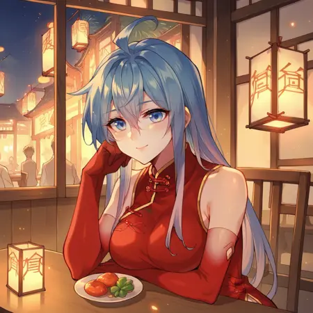 WangQiu, Wnq_6th, 渐变发色, 蓝发, 粉发, 长发, 蓝眼, 天线发, 红色连衣裙, 旗袍, 无袖, 中国结, 渐变手套, 红色手套, 替代肘套, 球形发饰, 红色流苏, 红色丝带, 头发丝带, 棕色连裤袜, 连裤袜, 露肩, 高马尾, 马尾,