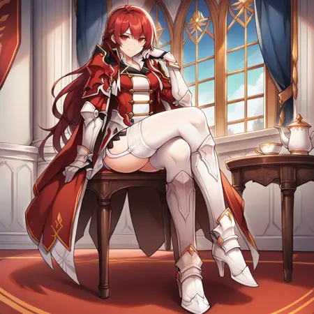 El_Swd, garter straps, ponytail, white thighhighs, alt thighhighs, military uniform, red coat, coat, white shirt, collared shirt, red cape, alt shoulder armor, alt white gauntlets, alt armor, knee boots, armored boots, miniskirt, black skirt, jewelry,