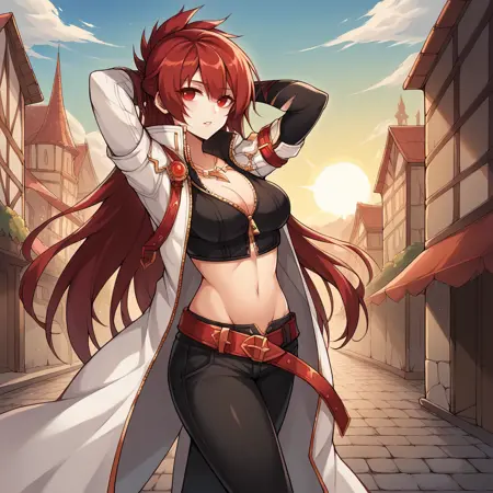 El_Flm, single pantsleg, asymmetrical legwear, red belt, midriff, black crop top, crop top, black shirt, white coat, coat, burnt clothes, asymmetrical clothes, uneven legwear, spiked hair, jewelry, black pants, zipper, cleavage, open coat, high collar, white sleeves, long sleeves, necklace, black gloves, elbow gloves, fingerless gloves,