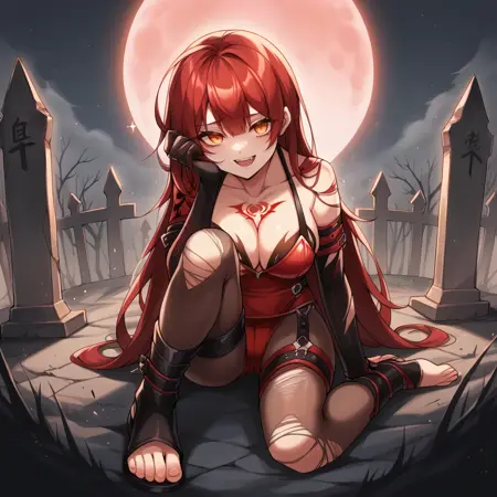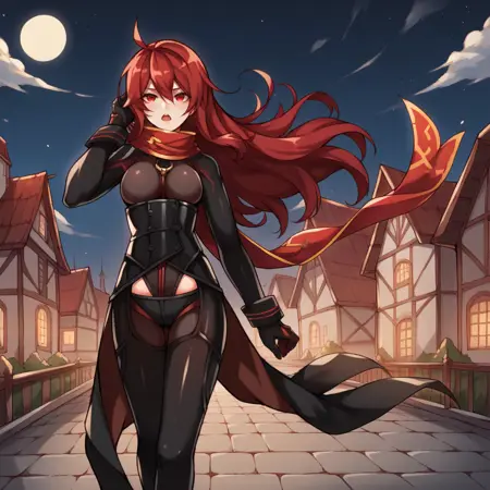 El_Kng, black bodysuit, bodysuit, black sleeves, long sleeves, black gloves, black corset, corset, black leggings, clothing cutout, between breasts, alt red belt, red scarf,