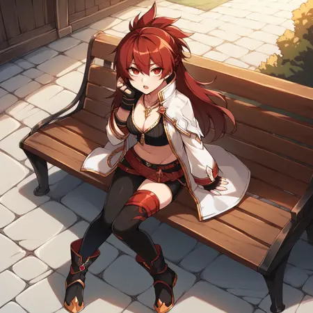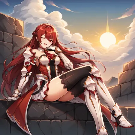 El_Swd、ガーターストラップ、ポニーテール、白い太ももハイソックス、代替太ももハイソックス、軍服、赤いコート、コート、白いシャツ、襟付きシャツ、赤いマント、代替肩アーマー、代替白いガントレット、代替アーマー、膝丈ブーツ、鎧付きブーツ、ミニスカート、黒いスカート、ジュエリー、