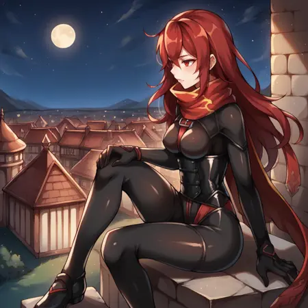 El_Kng、黒いボディスーツ、ボディスーツ、黒い袖、ロングスリーブ、黒い手袋、黒いコルセット、コルセット、黒いレギンス、服のカットアウト、胸の間、代替赤いベルト、赤いスカーフ、