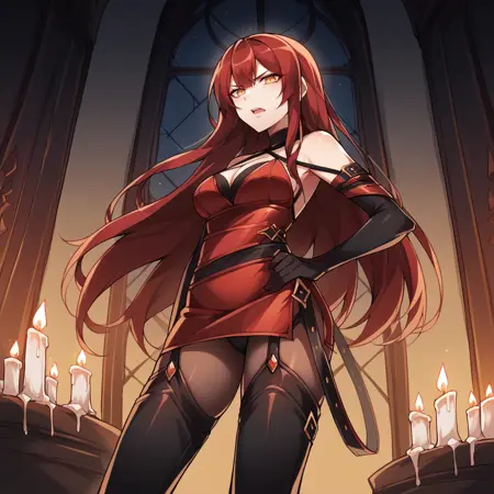 El_Avg、ショートドレス、代替赤いドレス、クロスハーラー、ロンググローブ、黒い手袋、茶色のパンチホース、黒いパンティ、黒い靴、太ももブーツ、代替赤いトリム、黒いベルト、ノースリーブ、胸元露出、黒いストラップ、