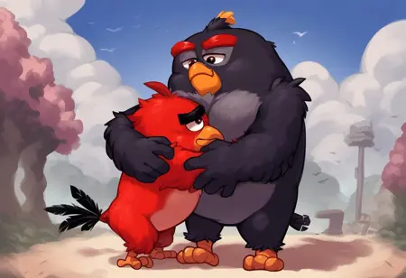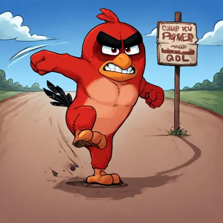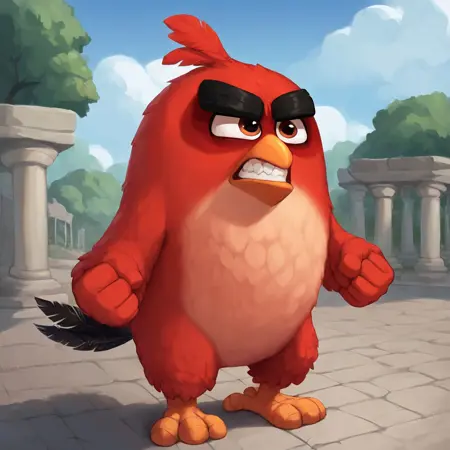 “Red_bird” 用于生成红鸟,需包含:‘红色羽毛、黑色眉毛、浓密眉毛、小喙、棕色眼睛、圆润身体、红色头顶毛簇、尾羽、羽毛状双手、带翼手臂、眼下黑圈、鸟类特征’ 以增强效果