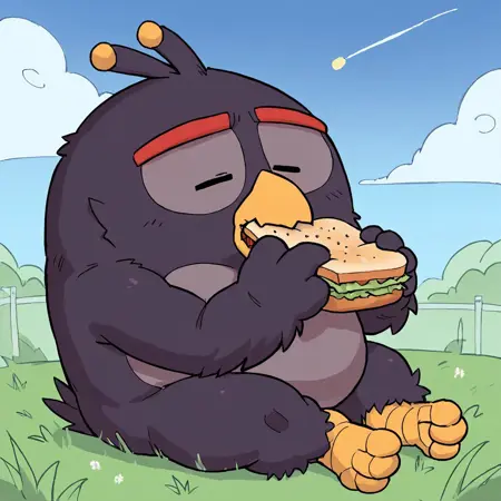 “Bomb_bird” 用于生成炸弹鸟,需包含:‘黑色鸟类、黑色羽毛、体型庞大、球形身体、灰色腹部、圆胖、喙、头顶毛簇、红色眉毛、短喙、大喙、羽毛状双手、带翼手臂、粗短腿部’ 以增强效果。