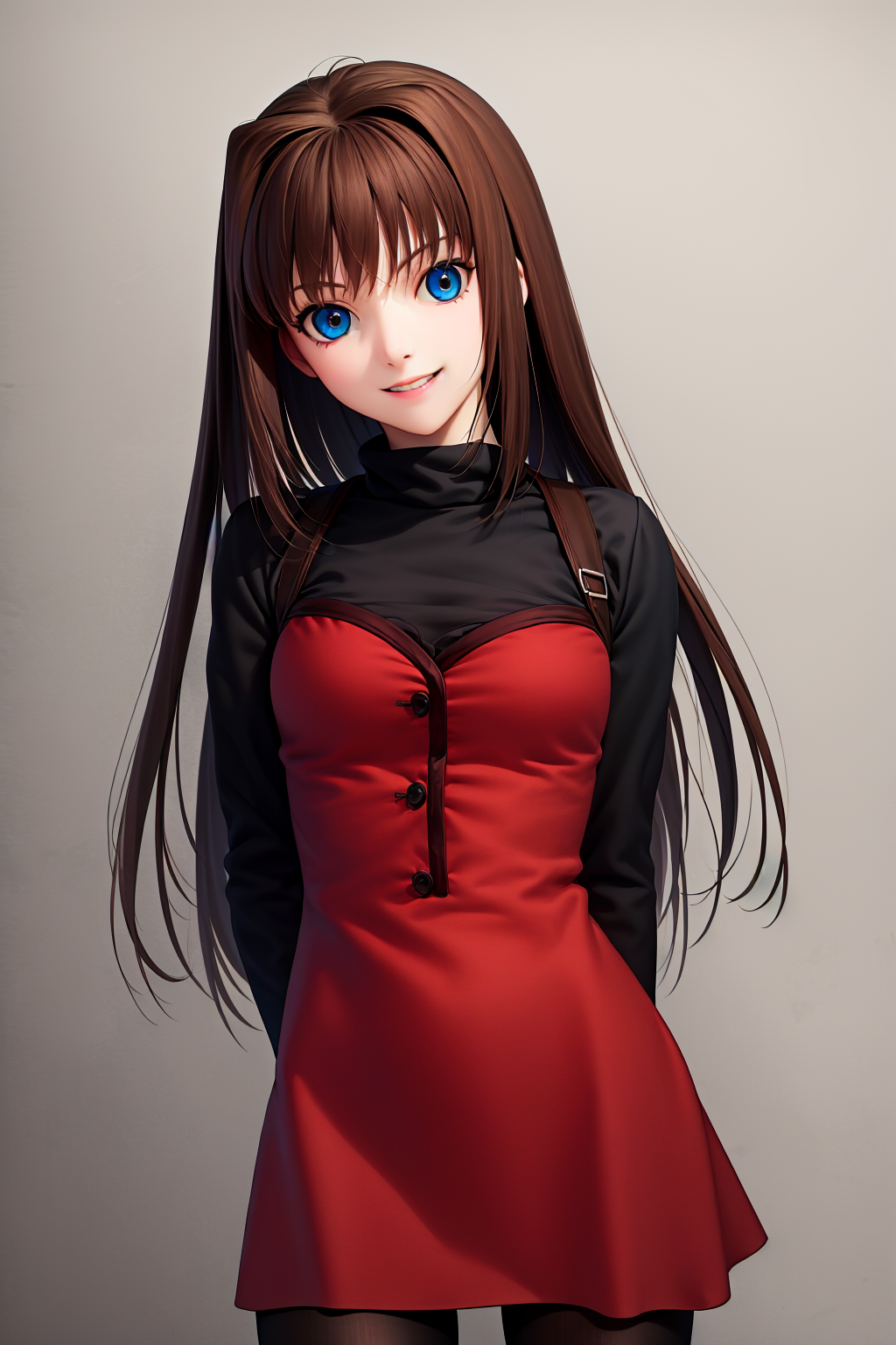 カジュアル: aozakidress, brown hair, red dress, pantyhose