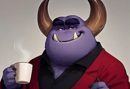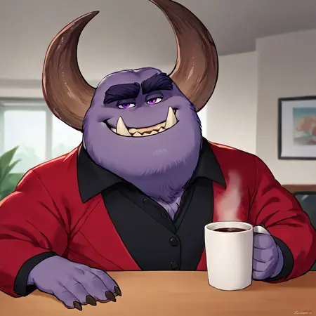 "johnny worthington, monster, satan-like monster, big horns, purple fur, upward-facing fangs, noseless, thick eyebrows, muscular, slighty chubby, purple eyes, claws, mature male, anthro"