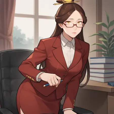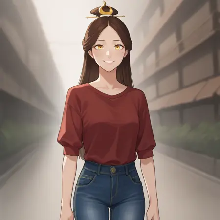 선택 사항: 긴 머리카락, 갈색 머리카락, 머리 장식, 노란 눈, 빨간 옷, 띠, 긴 소매
