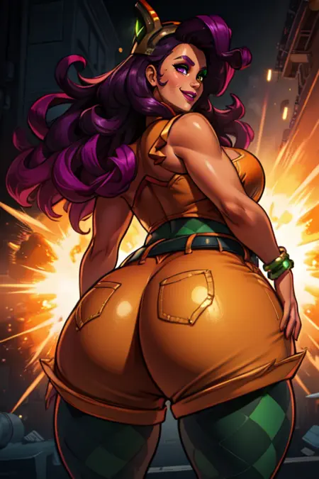 녹색 보석, 손가락 없는 장갑, 암버지 팔 Pants, 하이힐, 주황색 숏팬츠, 왕관 모자, 벨트, 주황색 상의, 둥근 귀걸이