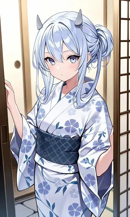 浴衣服装: I203yukataKC,长发,浅蓝色头发,花卉图案,白色浴衣,印花浴衣,带角头饰,折叠发型