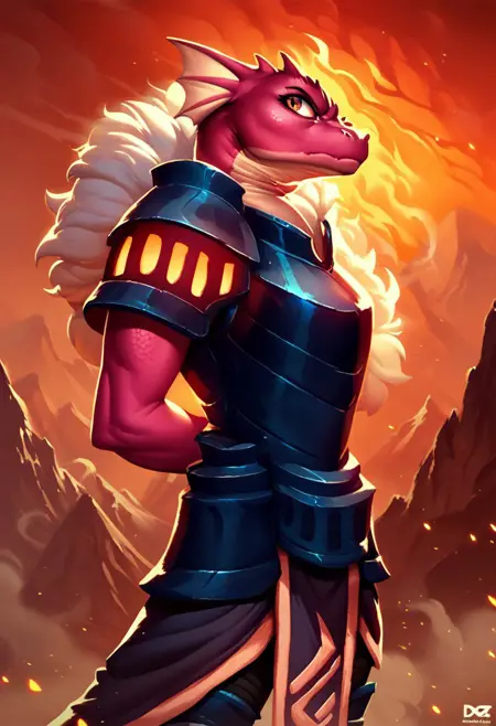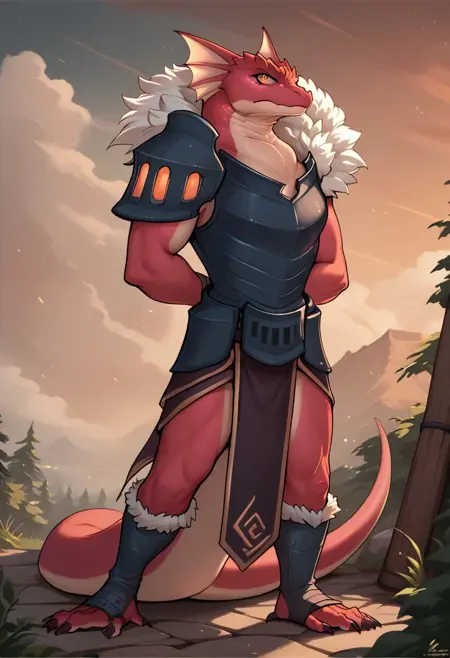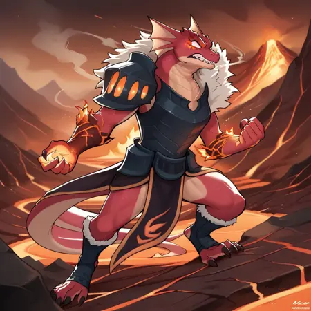 armor, toeless legwear, fur lining, loincloth, shoulder armor, pauldrons, flaming fist