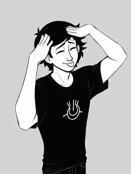 1ncrediman, 1boy, solo, male focus, pointy nose, half closed eyes, black hair, short hair, black eyes, monochrome