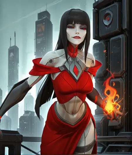 Ambra, red sclera, black eyes, black hair, blunt bangs,