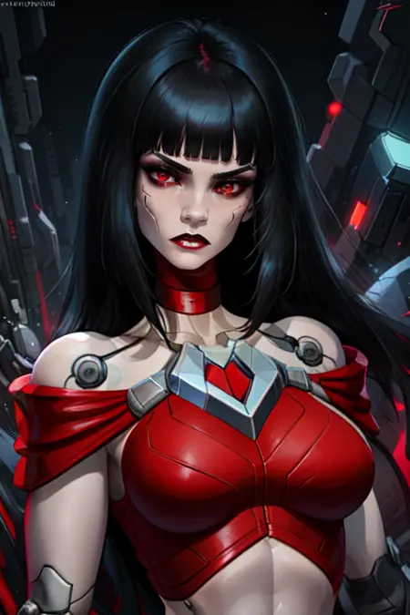 빨간 상의, 허리 노출, 어깨 노출, 빨간 목걸이, 긴 빨간 치마, 검은 장갑,