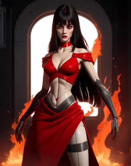 red top, midriff, bare shoulders, red choker, - long red skirt, -- black gauntlets,