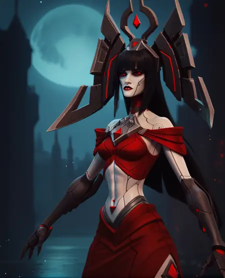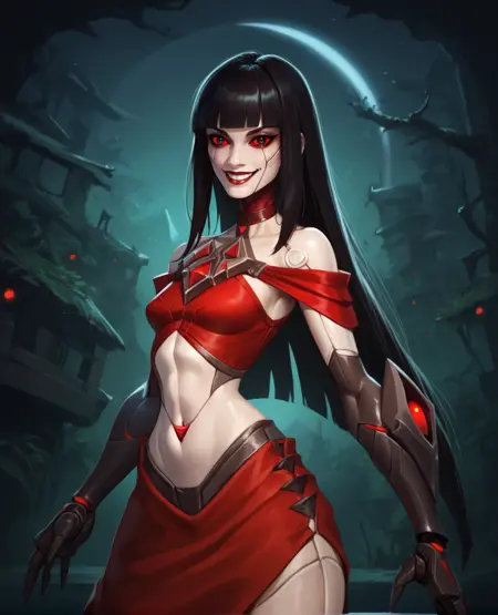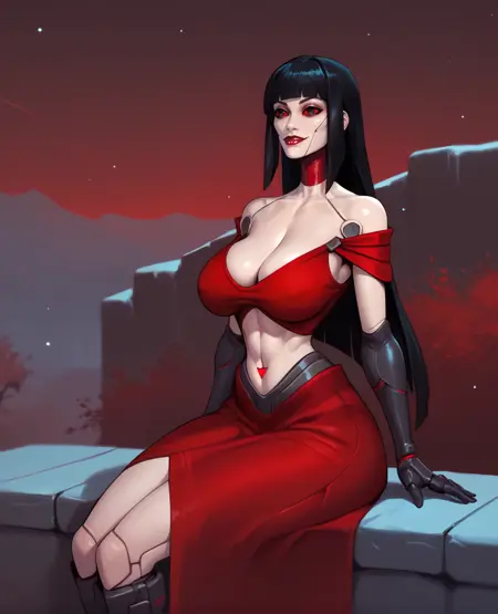 빨간 상의, 허리 노출, 어깨 노출, 빨간 목걸이, 긴 빨간 치마, 검은 장갑,