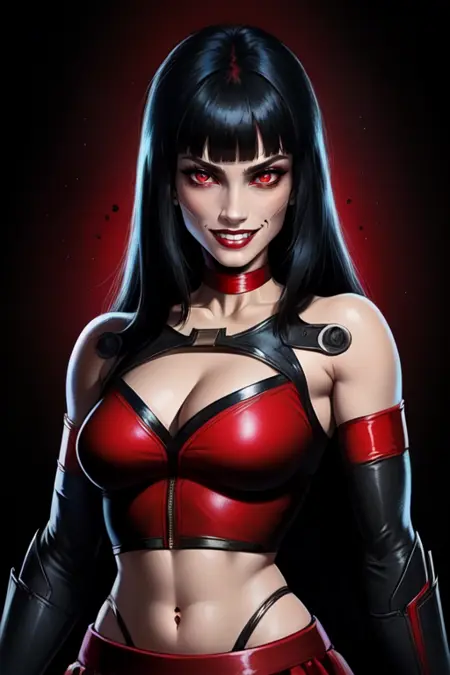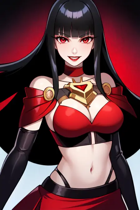 赤いトップス、腹部露出、肩出し、赤いチョーカー、長い赤いスカート、黒いガントレット