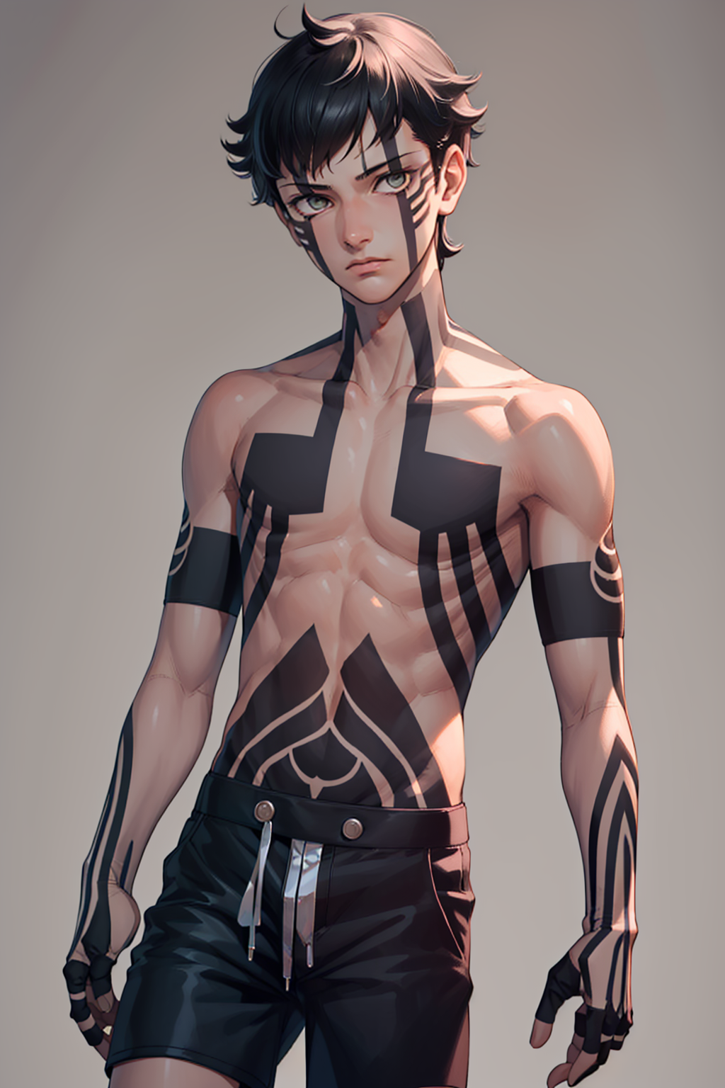기본 복장: topless male, shorts