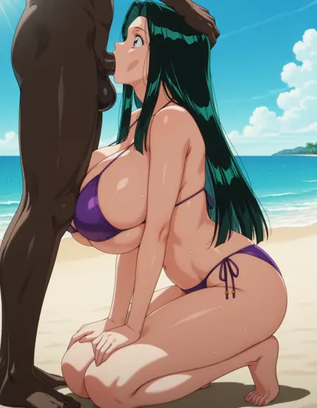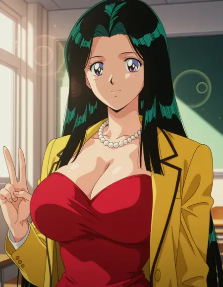 Ritsuko Takahashi, score_9,score_8_up,score_7_up,score_6_up,source_anime,anime screencap,BREAK, uncensored, cleavage, green hair, huge breasts, purple eyes