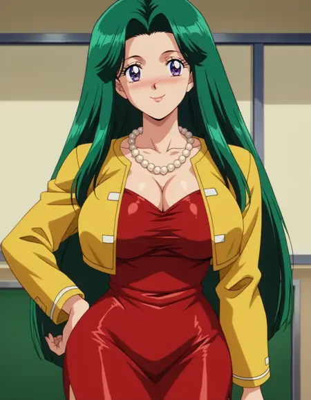 Ritsuko Takahashi, score_9,score_8_up,score_7_up,score_6_up,source_anime,anime screencap,BREAK, uncensored, cleavage, green hair, huge breasts, purple eyes