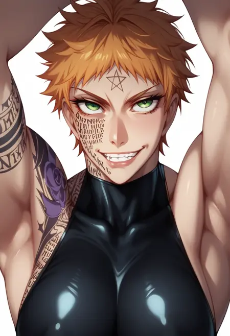 これは作るのが難しかったです。体のタトゥーが複雑でした。しかし、少なくとも動作させるには成功しました。AIはしばしばこのキャラクターを男だと誤認しますが、なぜかはわかりませんが、修正しました。彼女が nude の場合は、必ず「female」であることを明確に指定し、プロンプトのポジティブ項目に「breasts」を追加してください。異なる色の目を得るには「heterochromia」を追加してください。灰色の肌を得るには「gray skin」を追加してください。トレーニングデータには、彼女の狂った表情がいくつか含まれていたため、「crazy grin」と「crazy eyes」は効果的です。さらに工夫してみてください。体のタトゥーをより安定させるにはタトゥーを追加し、顔のテキストが表示されない場合は「face tattoo」を追加するとよいでしょう。より良い結果を得るために「1girl」と「female focus」を追加してください。