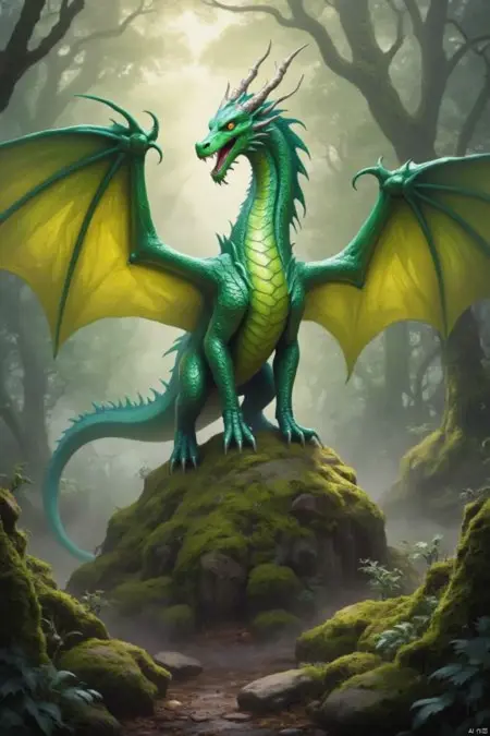 - 推奨:マジカルリアリズムの世界。緑の苔に覆われた岩の上に、鮮やかな緑色のドラゴンが立っている。ドラゴンの体は明るい緑色で、黄色のアクセントが施されている。口を開け、鋭い爪を見せている。