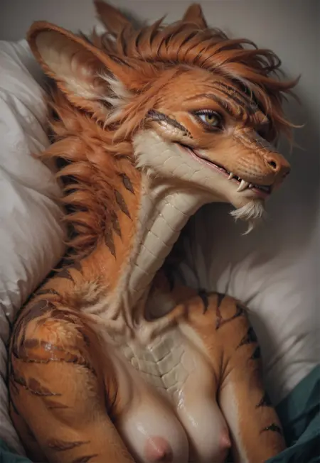 このモデルは、かなりよく機能しているようです。しかし、高解像度時にウロコが消えてしまうことがあることに気づきました。もしそのような問題が発生した場合は、キャラクターの説明の最初か中盤のあたりに「scaly belly」と追加してみてください。また、「long ears」というタグを加えると、よりネコやウーフのような耳の形状を避け、私が意図したような膜状の耳に近づける助けになります。