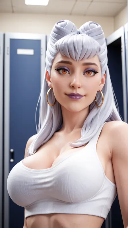 外观标签:长发、妆容、紫色嘴唇、白发、灰发、眼影、口红、发髻、橙色眼睛、睫毛膏、刘海、圆环耳环