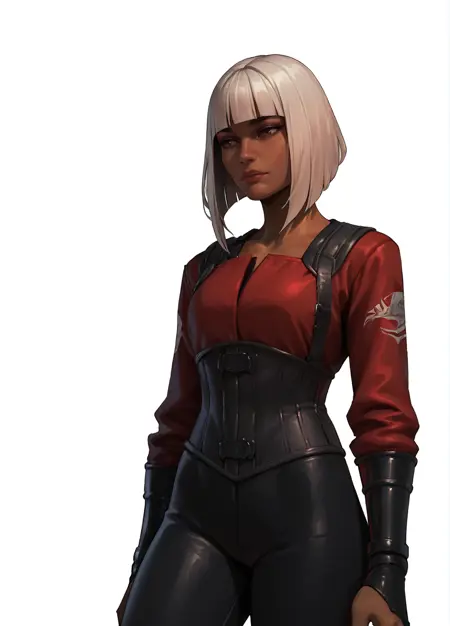 シャープロバ、ボブカット、黒い腕当て、赤いシャツ、長袖、コルセット、ストレートな前髪、黒いズボン