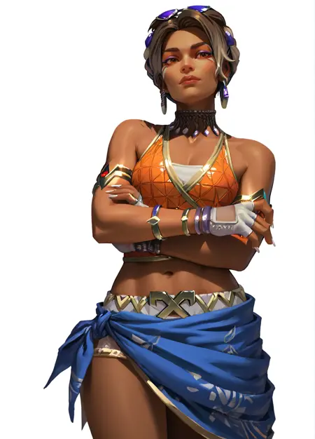 トラブルロバ、ジュエリー、お腹の部分、オレンジ色のショートパンツ、青いサロング、指なし手袋、太ももストラップ、へそ、ブレスレット