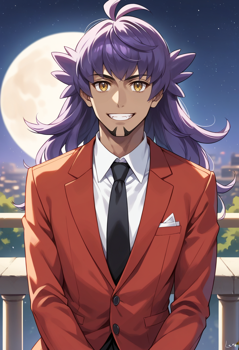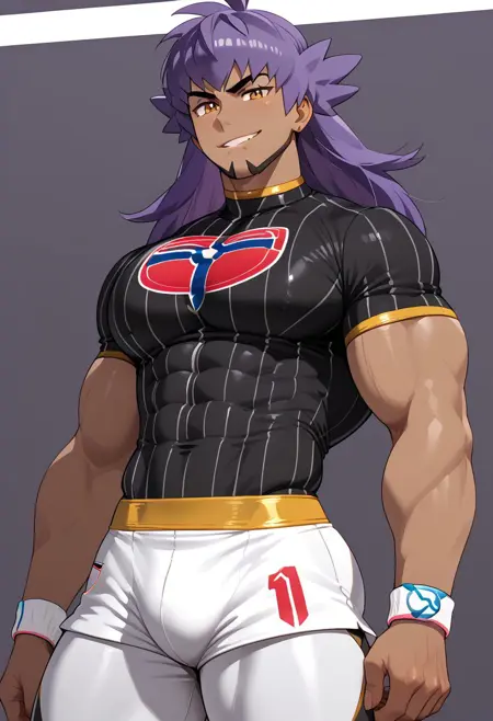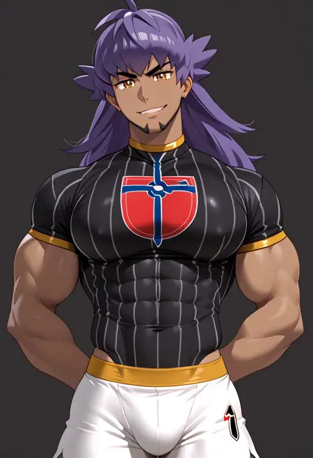 レオンポケモン、紫髪、顔ひげ、金色の瞳、男性、筋肉質、日焼けした肌、