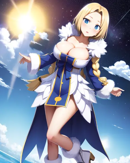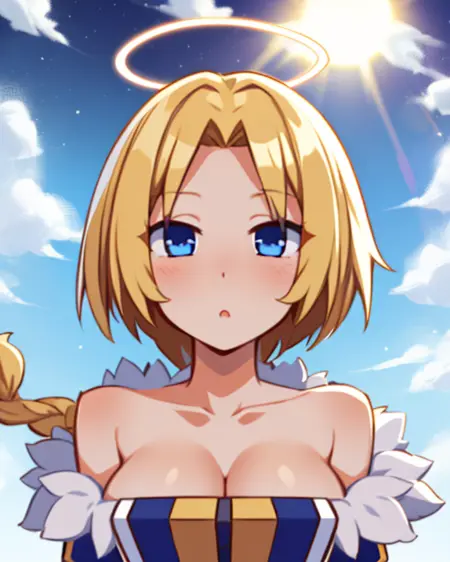 CelestialHostess, blonde hair with a single braid, blue eyes, - short hair, or bangs,