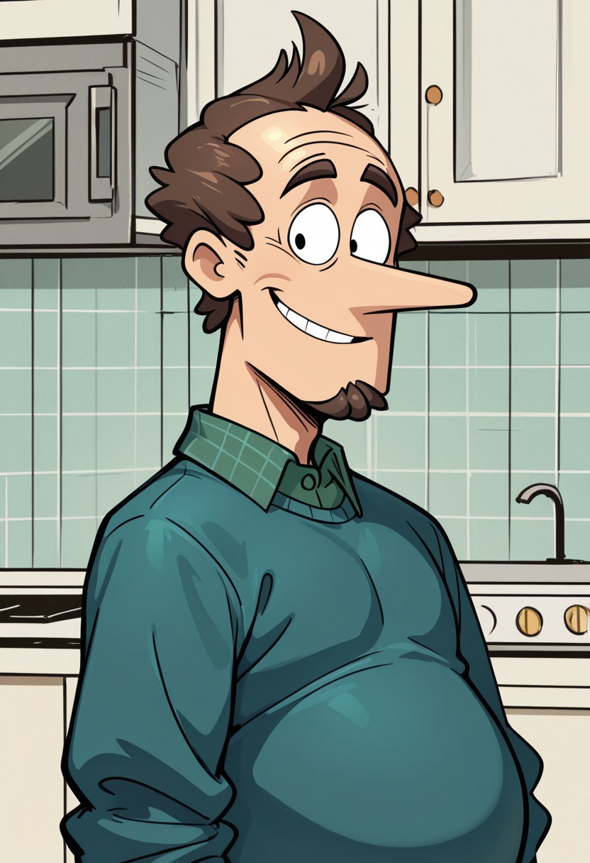 LynnLoudSr, male, solo male, human, mature male, long nose, black eyes, cartoon style, brown hair, receding hair, belly, bottom heavy