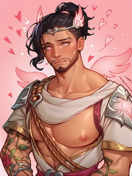 プロンプト: cupid_hanzo, 黒髪,ポニーテール,濃い茶色の目、顎ひげ、ギリシャ風の服、薔薇のタトゥー
