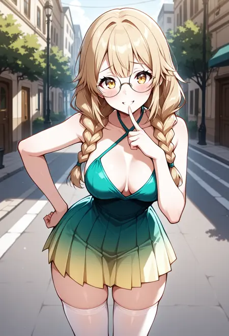 felminakumodesu, 쌍꼬리머리, 어깨에 걸친 머리카락, 노란 눈동자, 둥근 안경, 금발