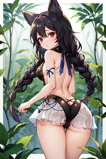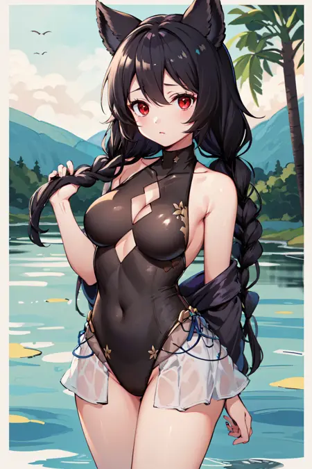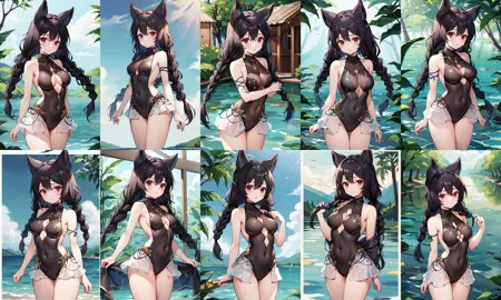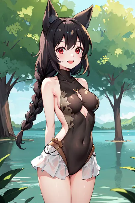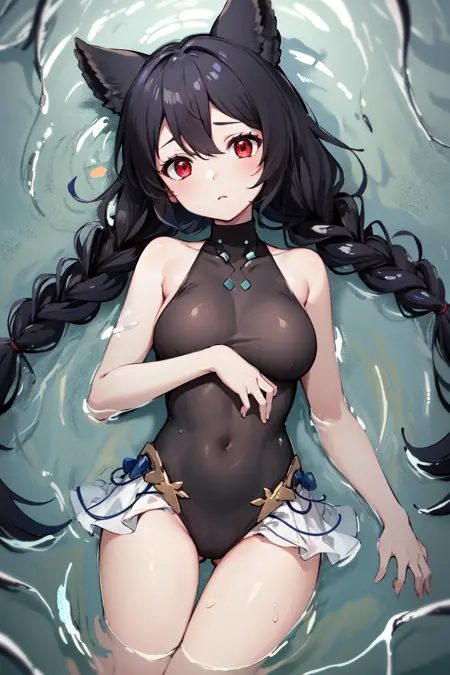 服装2hmnier, 动物耳朵, 红色眼睛, 黑色连体泳装, 双马尾, 裸露肩膀, 无袖, 高领, 蕾丝边