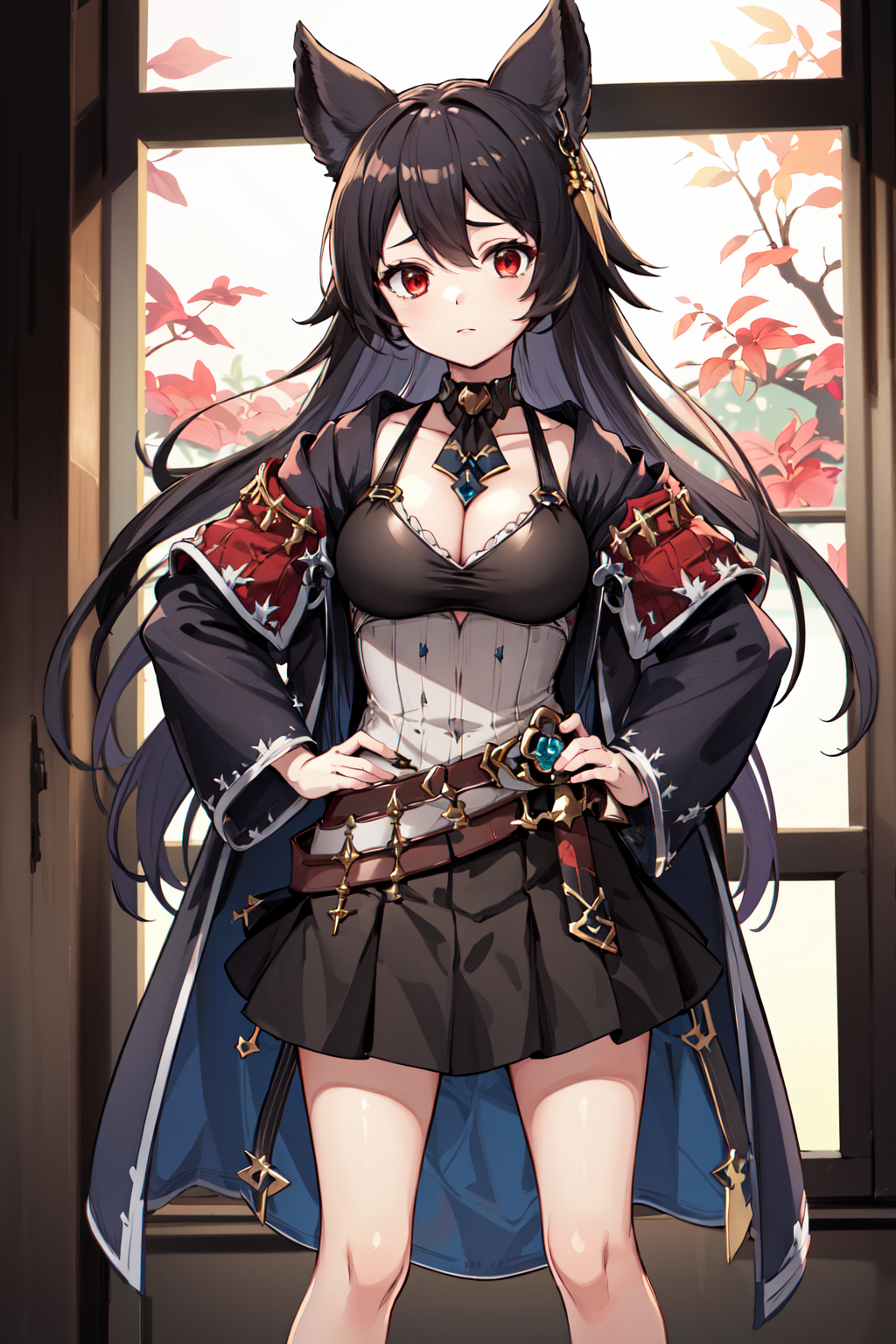 服装1hmnier, 动物耳朵, 红色眼睛, 耳钉, 项圈, 珠宝, 连衣裙, 乳沟, 夹克, 长袖, 腰带